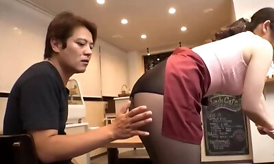 Japanese babe with big ass gets fondled by elder guy